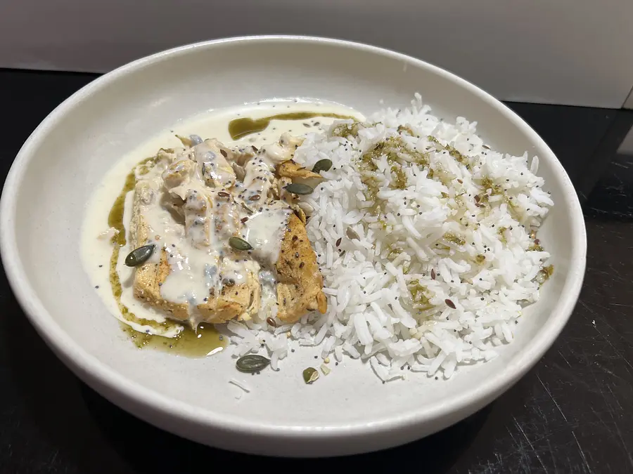 Peituga de polo confitada con puré de patacas e salsa de mostaza doce