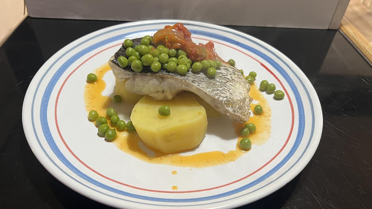 Filete de merluza fresca xusto pasado polas chamas, acompañada de patacas cocidas e guisantes verdes, que aportan un contraste de texturas e sabores. Rematada con un toque de aceite de oliva virxe e herbas aromáticas que resaltan a sencillez e autenticidade do mar. Una opción lixeira e nutritiva.