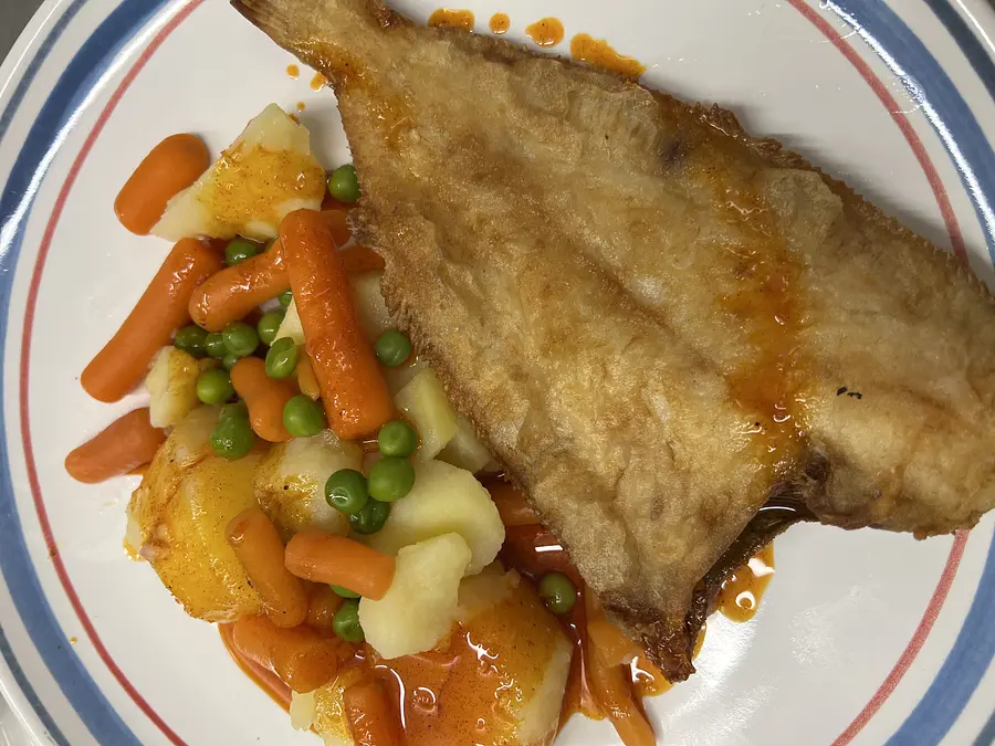 Rapante fresco cociñado á perfección, acompañado de sedosas patacas asadas e un toque de guisantes tenros que aportan un contraste de textura. Un prato que resalta a esencia dos produtos do mar e da terra, ideal para os amantes da culinaria en harmonía.
