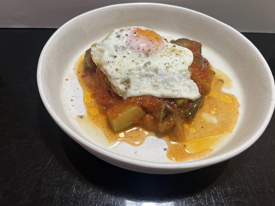 Colorido e nutritivo pisto de verduras de tempada, cociñado a lume baixo, con pementos, cebola, tomate e berenxena, rematado cun ovo frito de xema fluída que se funde á perfección co conxunto.