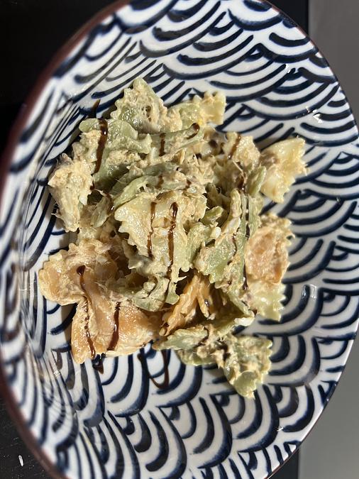 Esta ensalada de pasta é un festín de sabores marinos e terrosos. Combina tierna pasta con suxestivos langostinos, exquisito atún vermello e pavo asado, todo conxelado en un delicado aliño de limón e herbas frescas. Ideal para unha comida lixeira e nutritiva.
