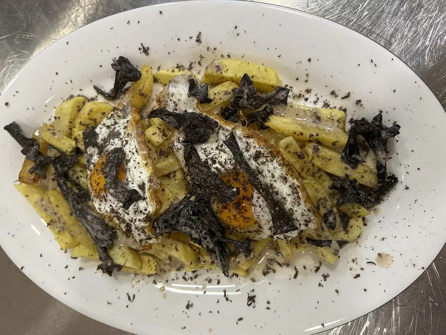 Ovos fritos do “volteiro” con patacas fritas, trompetas dos mortos e trufa