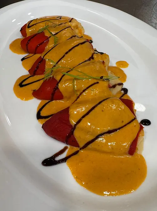 Saborosos pementos do piquillo, delicadamente recheos cunha suculenta mestura de marisco fresco, acompañados dunha crema suave de salsa de tomate e un toque de especias. Unha explosión de sabores que evoca o mellor do mar, presentados con arte e elegancia. A perfección na cada bocado.