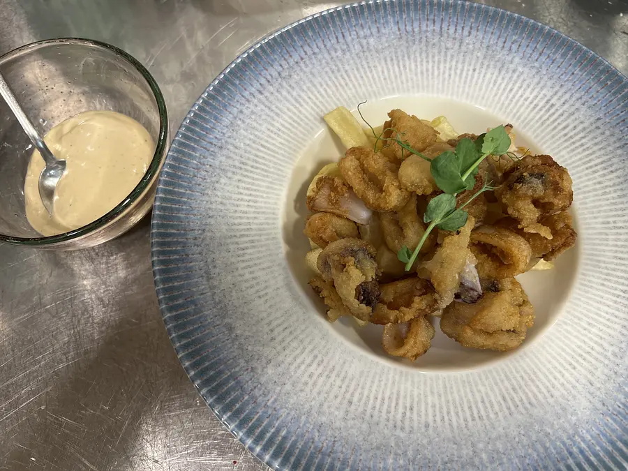 Exquisitos chipiróns fritos, dourados á perfección, que conservan toda a súa tenrura. Servidos cun cremoso ali-oli negro de encebada, que aporta un sabor profundo e intenso, realzando a frescura do mar. Unha experiencia gourmet que combina tradición e modernidade.