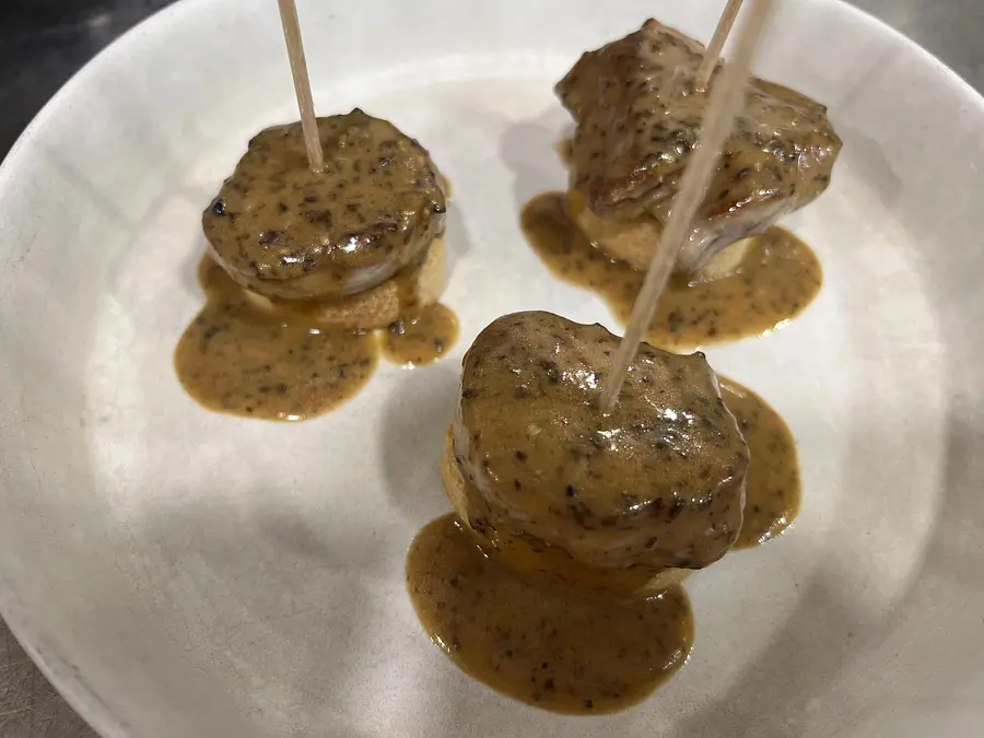 Pequeno manxar que combina a tenrura do solomillo ibérico, selado á perfección, sobre un rebordo de pan tostado. Acompañado de cebola caramelizada e un toque de salsa de mostaza, cada bocado ofrece unha explosión de sabores que homenaxea a tradición galega e a excelencia da cociña ibérica.